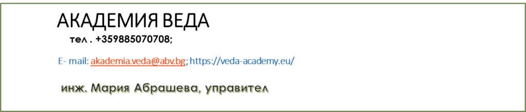 АКАДЕМИЯ ВЕДА – е утвърден доставчик на висококачествени услуги в сферата на образованието. Академията е оценена и одобрена за съответствие с изискванията на ISO 9001:2015.